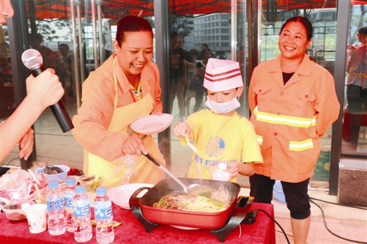 5月28日上午,南寧經(jīng)濟開發(fā)區(qū)開展“關(guān)愛農(nóng)民工 綠港小廚神”主題親子活動。轄區(qū)內(nèi)的園林綠化工人、水電維修物業(yè)工人、保潔人員等300多名進城務工人員及其子女參加了本次活動。
