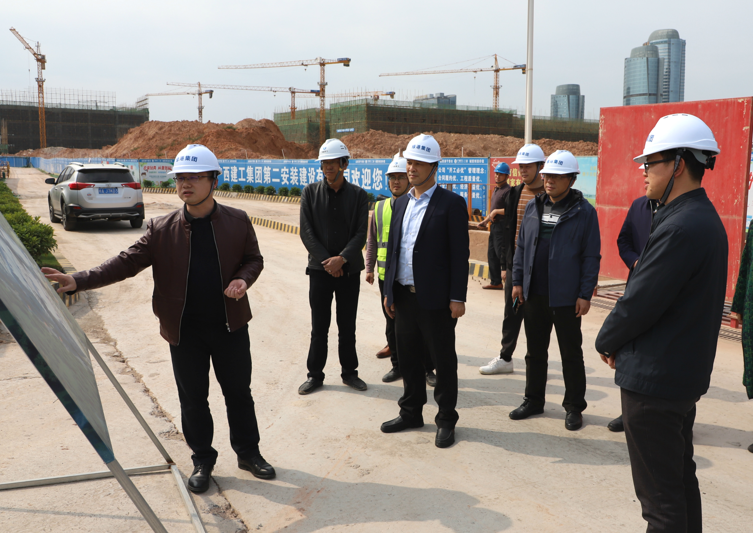 交流學(xué)習(xí)組一行首先來到綠港·金瑞產(chǎn)業(yè)城一期項(xiàng)目施工現(xiàn)場(chǎng),參觀項(xiàng)目建設(shè)情況,集團(tuán)黨委書記、董事長(zhǎng)龔國強(qiáng)向交流學(xué)習(xí)組介紹了綠港·金瑞產(chǎn)業(yè)城項(xiàng)目情況:綠港·金瑞產(chǎn)業(yè)城項(xiàng)目位于南寧經(jīng)開區(qū)高嶺路南側(cè)、金陽路西側(cè),占地245畝,總投資約13億元,總建筑面積約406039.74㎡。項(xiàng)目包括17個(gè)單體建筑,分三期建設(shè),該項(xiàng)目是南寧市級(jí)層面統(tǒng)籌推進(jìn)的重大項(xiàng)目,是為廣西千億產(chǎn)業(yè)園——瑞聲科技(南寧)產(chǎn)業(yè)園量身定制的高標(biāo)準(zhǔn)廠房。項(xiàng)目投產(chǎn)后,可加快推動(dòng)南寧經(jīng)開區(qū)工業(yè)經(jīng)濟(jì)新舊動(dòng)能加速轉(zhuǎn)換,優(yōu)化區(qū)域營(yíng)商環(huán)境,助推南寧經(jīng)開區(qū)核心實(shí)體經(jīng)濟(jì)的發(fā)展。