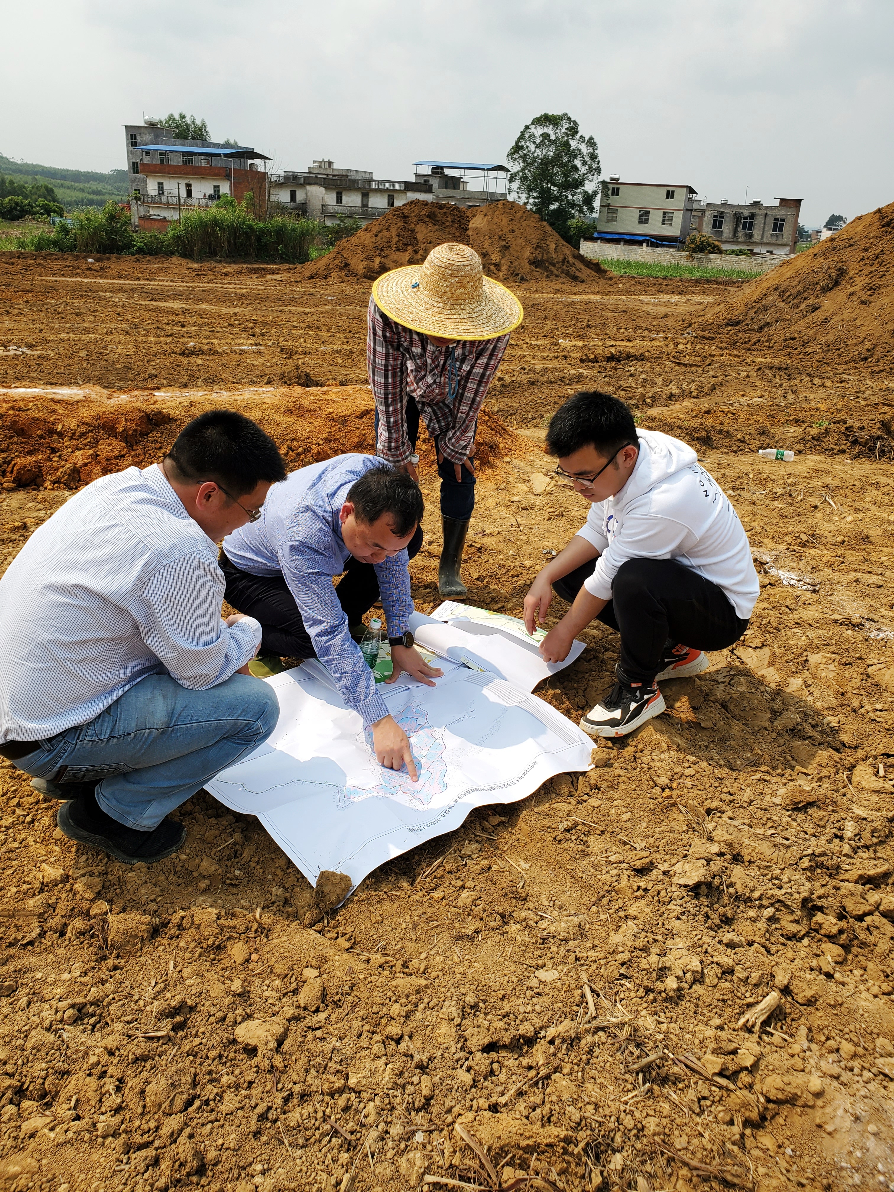 項目勘探初期,科巨公司多渠道開展選址工作,總經理覃遠生利用本地人的先天資源優(yōu)勢,積極對接吳圩鎮(zhèn)國土資源所,政企結合多次走訪吳圩鎮(zhèn)各村委大隊,積極開展旱改水政策宣傳,尋找選址線索。同時以市政二部作為班底,分管副總經理莫際樂為組長,市政二部副經理張海毅、土建工程師李永華為主力,成立旱改水專項工作小組,走村進寨,跋山涉水,深入田間地頭開展群眾宣講,足跡遍布吳圩鎮(zhèn)的大小村落,山野村林,在自治區(qū)國土測繪院指導下,最終擇優(yōu)選定平垌村作為旱改水項目實施地。