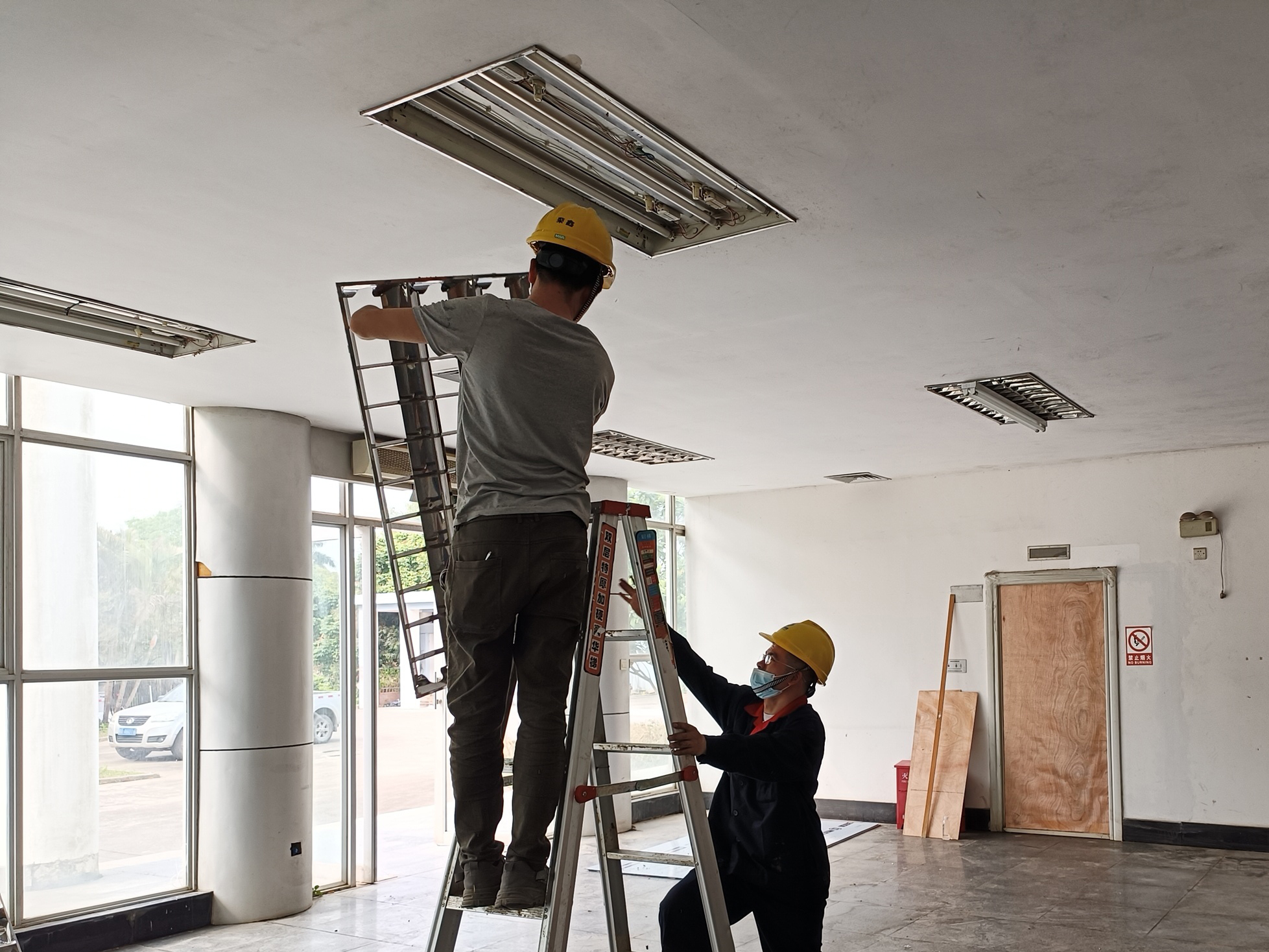 為盡快通水通電,室內(nèi)的工人一個插座一個插座地接線測量,一個電燈一個電燈地安裝測試,一個水管一個水管地通水調(diào)試。室外的工人則打開大院的配電房,從配電房里接出90米長的50m㎡銅芯電纜,以滿足檢疫消殺的電力需求。