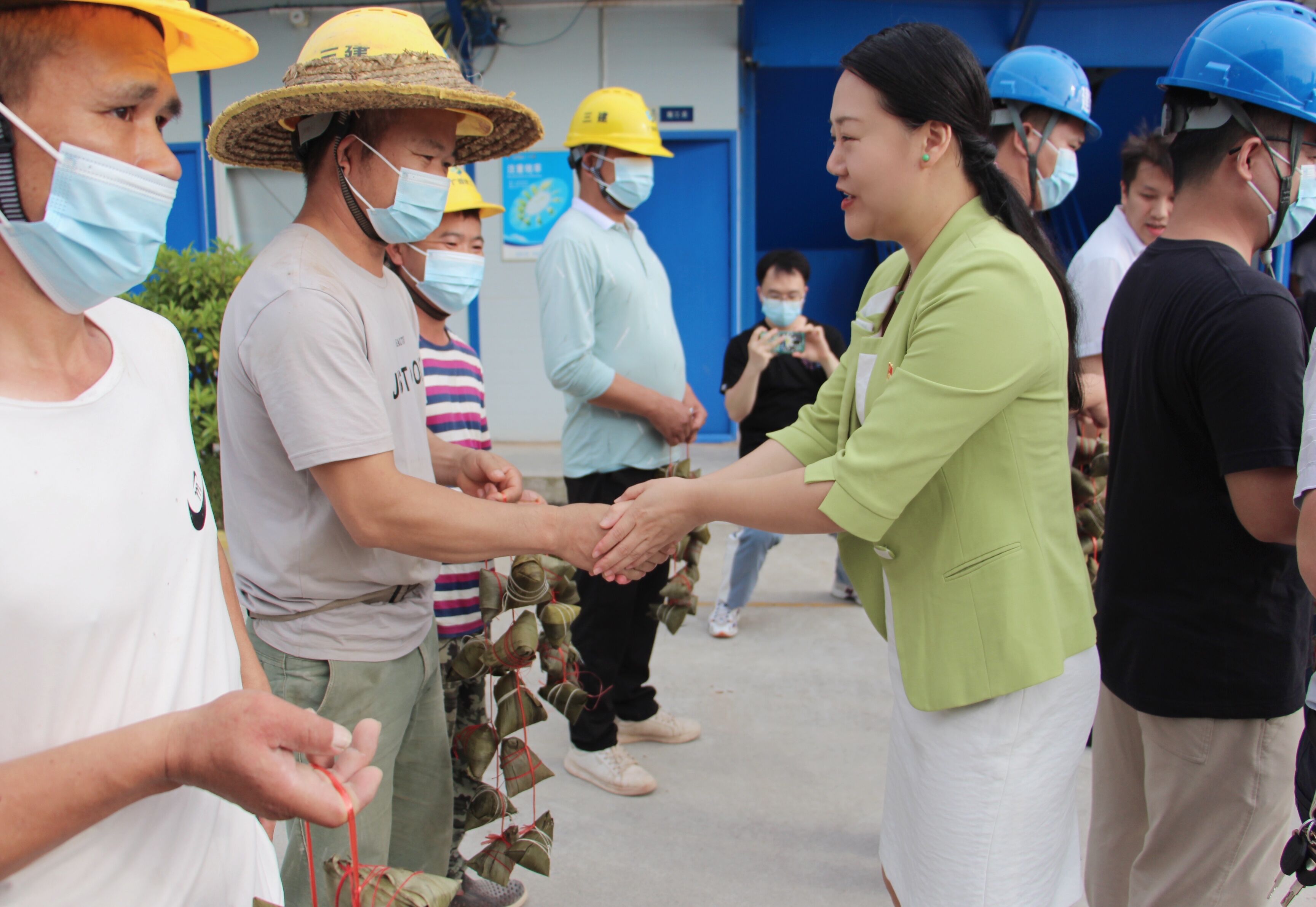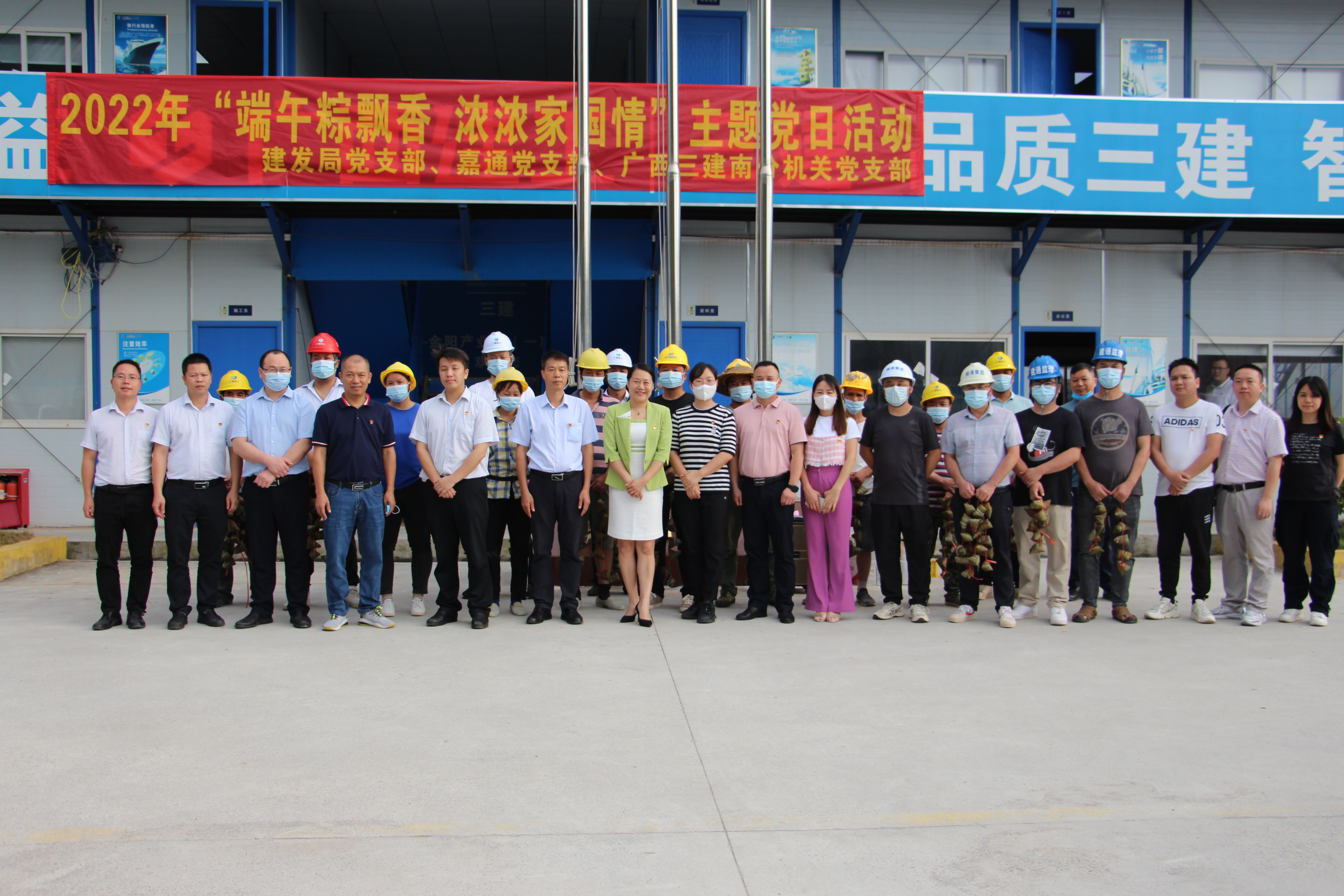 荷月繁花似錦來(lái),粽米飄香溫情至。端午佳節(jié)將至,為進(jìn)一步傳承中華民族傳統(tǒng)文化,深入挖掘端午節(jié)的文化內(nèi)涵,增強(qiáng)文化自信,弘揚(yáng)新時(shí)代愛(ài)國(guó)主義精神,涵養(yǎng)廣大黨員的家國(guó)情懷,6月1日,嘉通公司黨支部聯(lián)合經(jīng)開(kāi)區(qū)建設(shè)發(fā)展局黨支部、廣西三建南分機(jī)關(guān)黨支部深入綠港?金陽(yáng)產(chǎn)業(yè)城項(xiàng)目開(kāi)展2022年“端午粽飄香 濃濃家國(guó)情”主題黨日活動(dòng),為項(xiàng)目一線工人送去粽子等慰問(wèn)品以及節(jié)日問(wèn)候。綠港集團(tuán)黨委委員、副總經(jīng)理、嘉通黨支部書(shū)記黃麗琴以及嘉通公司黨支部全體黨員參加活動(dòng)。