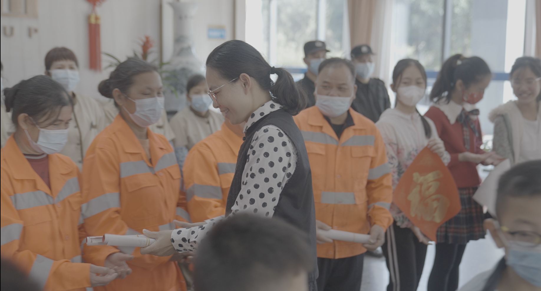 一平一仄譜喜悅,一撇一捺書祝福,活動(dòng)最后,公司領(lǐng)導(dǎo)及志愿者們向30名來(lái)自一線的市政、綠化工人與物業(yè)服務(wù)人員贈(zèng)送了春聯(lián),并向他們表達(dá)了濃濃的關(guān)懷和新春祝福?!按汗?jié)貼春聯(lián)是我們的傳統(tǒng)習(xí)俗,過年的時(shí)候在家門口貼上親手寫的“?!弊志透幸饬x了,非常感謝集團(tuán)公司在每年春節(jié)即將到來(lái)之際給我們送來(lái)這么好的禮物?!睒s鑫公司綠化工人唐素廂拿到春聯(lián)后高興地說(shuō)。